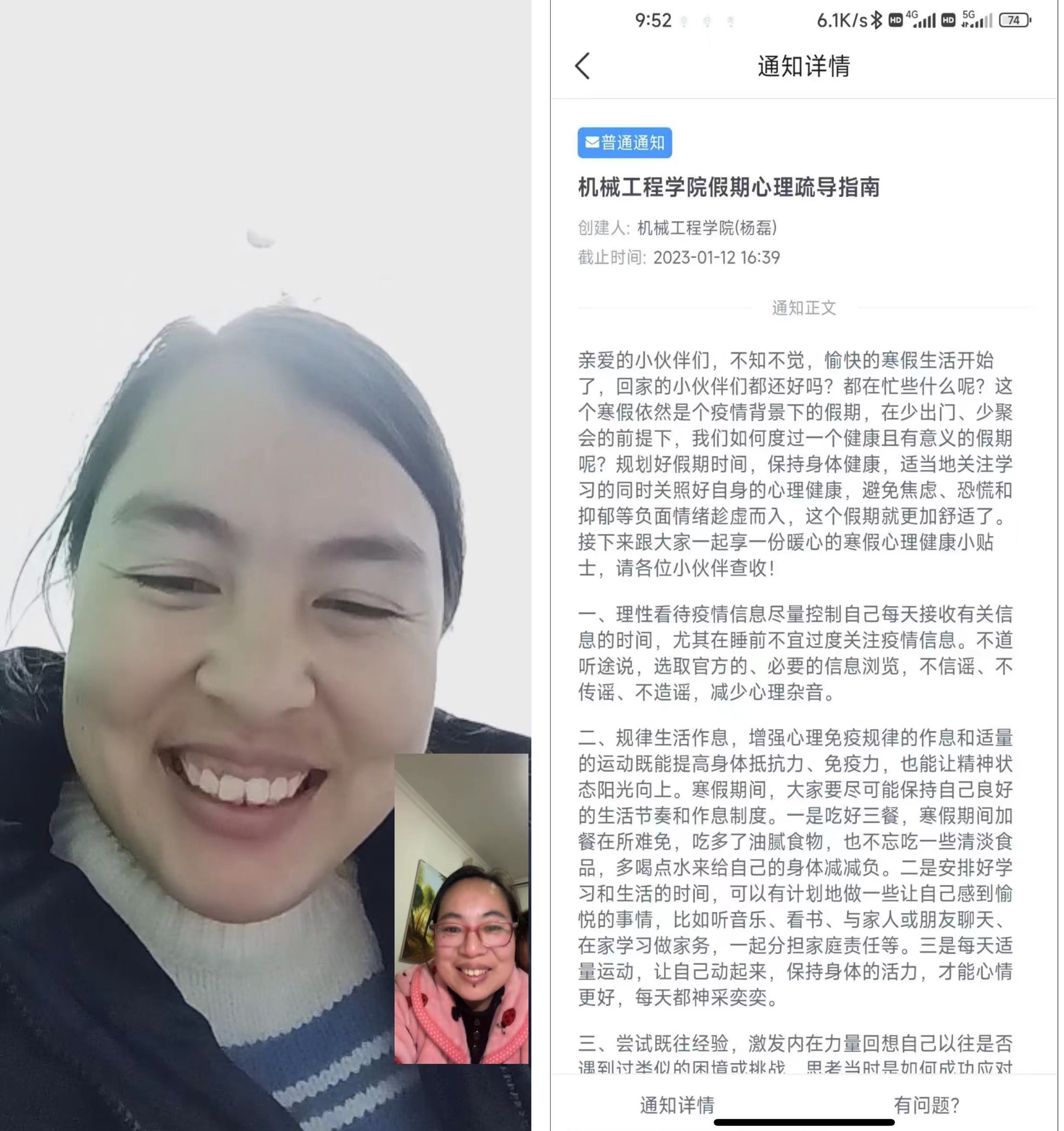 本次“心理疏导”活动体现了学院对全体学生的深厚关怀,将“安全”与“健康”相结合,让学生在寒假期间也能感受到学校和老师的“温暖”。也把我院“立德树人”工作推上一个新台阶。(发稿/图片:邹传娟 审核:郭琪/李琛)