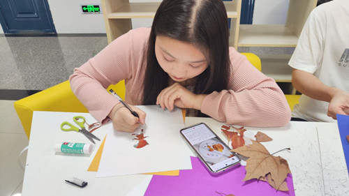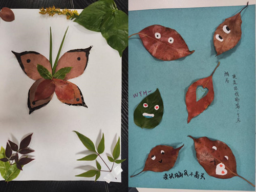活动开始,同学们在校园的四周寻找创作所用素材,在构思艺术创作的同时,相约好友欣赏校园秋日美景。而后同学们充分发挥自己的艺术特长,在不破坏叶子原本形态的前提下利用其特征进行创意设计,并结合多种素材加以改造,展现出具有设计美感的“秋叶”,呈现风格各异、别具一裁的“秋色”。