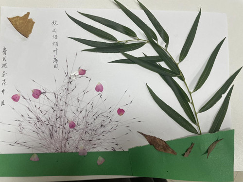 电商3223班张政飞同学谈及创作灵感时说道:“黄棕交错的色系给人的第一印象便是秋天,利用长短不一的草叶与喜树花,在纸面呈现了一束色彩层次丰富、叶片错落有致的立体“花束”。这是我献给秋季的一束花。“会计3221班学生周晶晶表示,此次创作体验很美好,在搭配色彩与固定草叶时,心绪会慢慢地平静,在一草一木中体会秋季的韵味。伴随着舒缓的音乐,同学们将奇思妙想呈现于白纸上,使落叶在艺术创作中焕发生机。