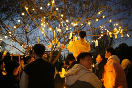 二级心理辅导站负责人吴帅老师对本次活动进行了总结,她鼓励同学们要努力成为一个有温度的人,成为一个有温暖的人,不断增强自信,便能够一往无前。随后,同学们在许愿卡上写下今天活动的感受和心愿,来到“微光树”下,将许愿卡挂在树上,并纷纷合影留念。