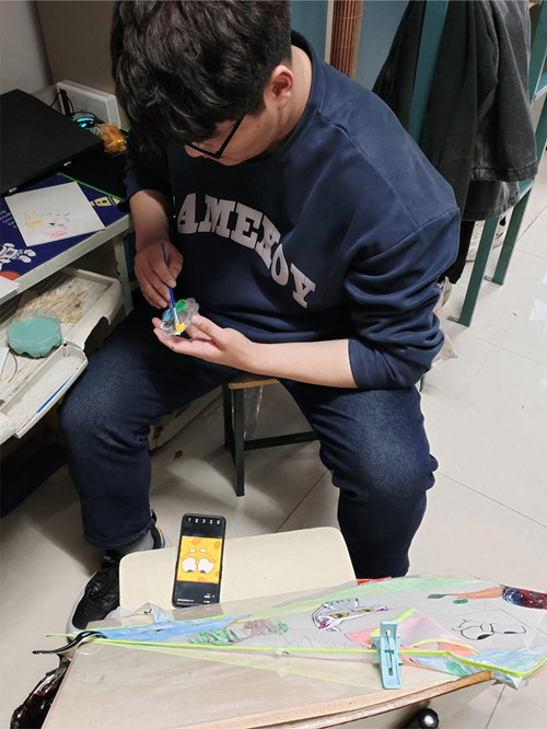第一次在空白风筝上涂鸦出自己内心世界,感觉很奇妙”,“虽然我画的不太好,但用笔画出内心想法的体验真的很棒”。用笔描绘,用心感悟,用情出彩。学生在设计风筝过程中,团队配合默契,颜料上色仔细,手工创意作品思路清晰,又不乏创新,画面或温情,或活泼,或新颖独特,充分体现学生对放飞梦想的期盼和感悟,彰显了励志和心理关爱的真谛。学院党总支副书记张朝兵对此次活动高度关注,并带领学院专职辅导员对学生们DIY风筝进行了评比,最终智焊3222班级李金涛、马浩宇、张峰瑜设计的风筝《梦想者》获得一等奖,其余学生分获二、三等奖和优秀奖。