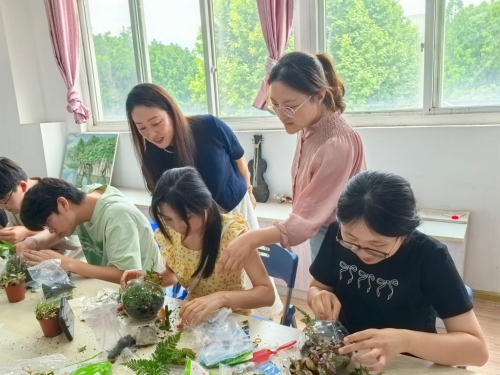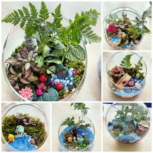 活动中,同学们根据提供的材料包,挖坑、种绿植、压土、喷水,忙得不亦乐乎。一土一铲种下内心的感受和对生活的向往。同学们充分发挥自己的奇思妙想,运用植物、苔藓、营养土以及装饰品等物品,方寸间打造出高低不同、错落有致、层次分明的“心”世界。在一片欢声笑语中,一个个充满生命力的精致景观呈现在大家面前。