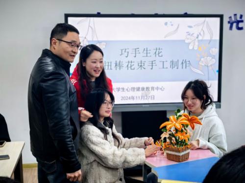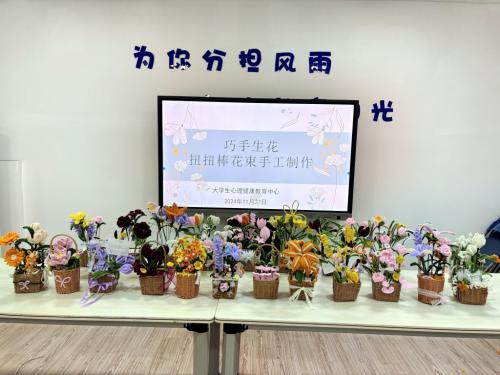 为进一步发挥“以美润心”、“以劳健心”育人功能,丰富心理育人载体和形式,11月27日下午,学校在心理中心成功举办主题为“巧手生花”扭扭棒花束手工制作活动。学生处副处长单玲、心理中心老师及40名学生参与活动。