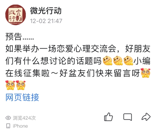 12月2日,“微光”辅导员工作室通过“微光行动”官方QQ账号发起话题讨论,引发了同学们的热烈讨论。例如:“喜欢重要还是合适重要?”、“恋爱会腻吗?”、“女朋友生气,给她讲道理不哄她就是不爱她吗?”等等。每一条留言背后都是同学们成长过程中真诚而又美好的小烦恼,“微光行动”的QQ空间也成为了这些小烦恼的倾诉消散地。