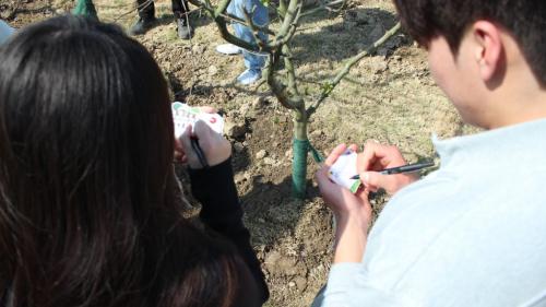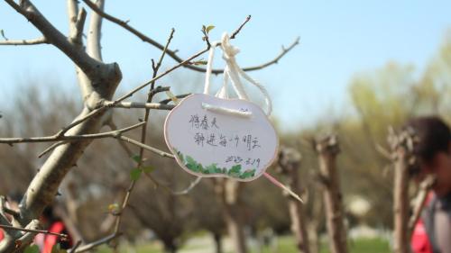 活动伊始,园林工程师邢琴以一棵海棠树苗为引,为同学们带来了一堂别开生面的“生命教育课”。她以海棠的生长周期为切入点,深入浅出地讲解了海棠树的特性、土壤适应性及修剪技巧,将专业知识娓娓道来。随后,两院学生通过抽取“好事花生”“心想事‘橙’”“‘莓’有烦恼”等趣味签语随机组队,为活动增添了欢乐气氛。在种植环节中,各小队领取树苗与工具后便热火朝天地投入其中,同学们分工协作,有的挥锹铲土、夯实根基,有的细心扶正树苗、浇水灌溉,彼此配合默契,现场洋溢着青春的热情与活力。种植结束后,每位同学都领取了专属的“心灵认养卡”,为亲手栽种的树苗命名并书写心愿寄语。同学们或凝神静思,或会心一笑,将对未来的期许与对自我的鼓励倾注笔端,为这场别具意义的活动画上了圆满的句号。